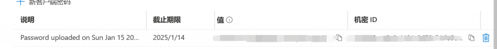 然后就可以看见值和机密 ID,我们只需要记录下 值 就可以,这个就是 client_secret 。