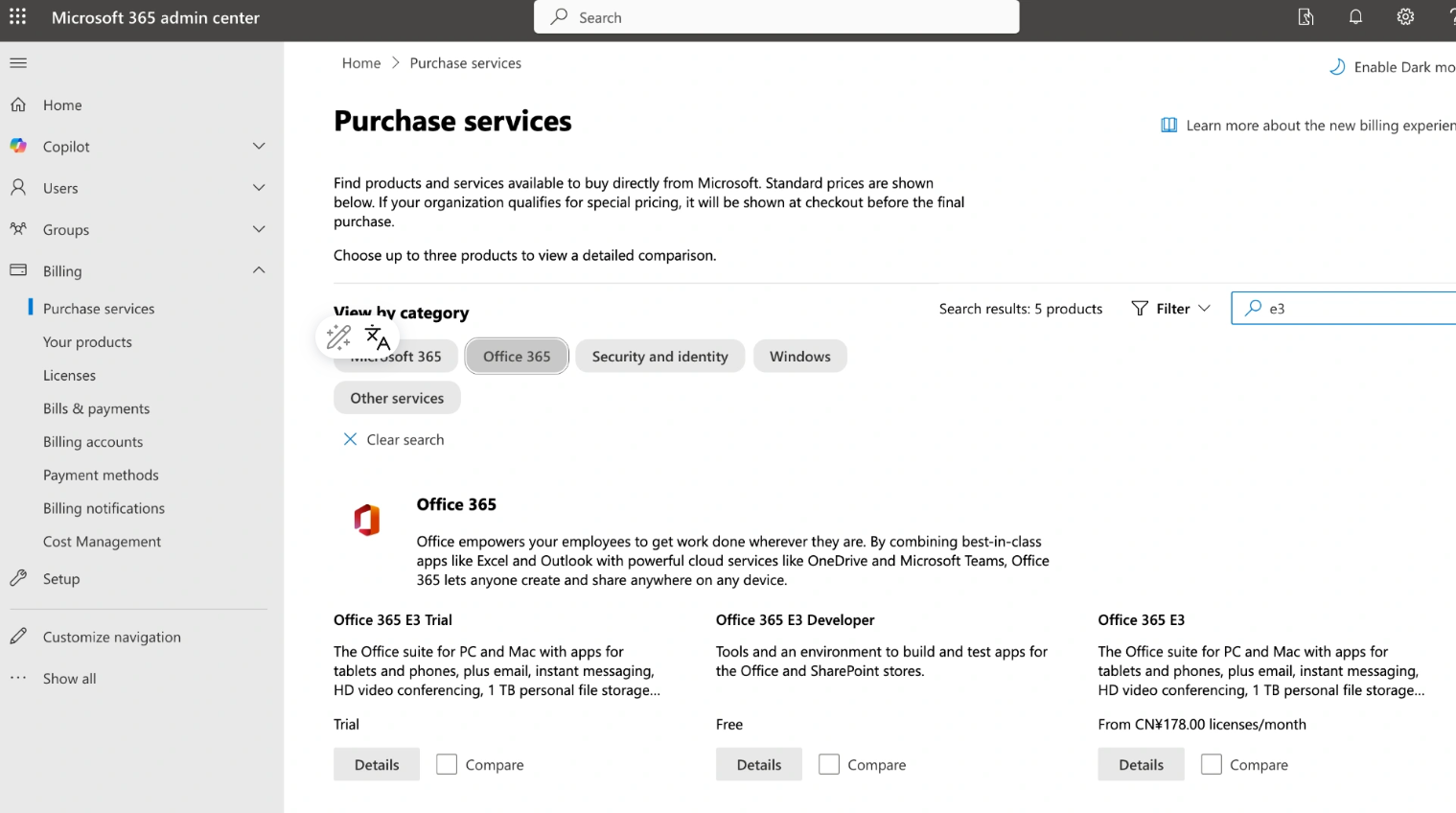 filter 过滤 e3 找到 Office 365 E3 Devloper.... 点Details